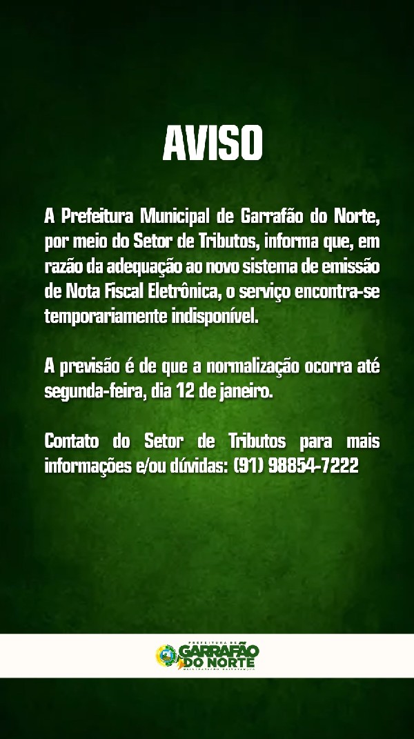 A Prefeitura Municipal de Garrafão do Norte, por meio do Setor de Tributos, informa que, em razão da adequação ao novo sistema de emissão de Nota Fiscal Eletrônica, o serviço encontra-se temporariamente indisponível.